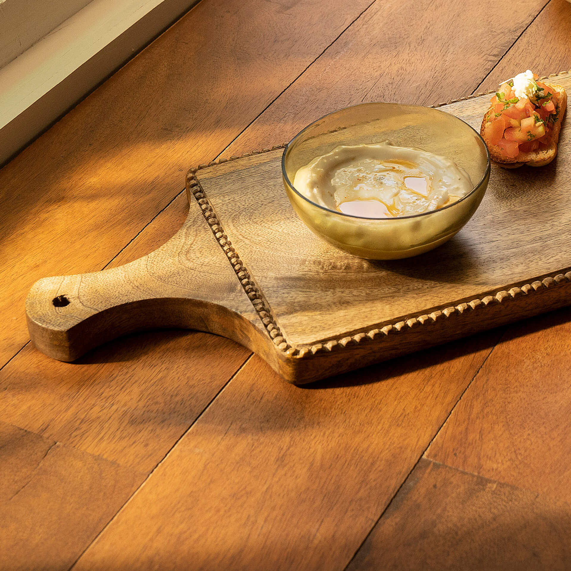 Enhance your serving game at parties, feasts, or a movie bash by serving snacks with dips on this wooden platter with a bowl. Handcrafted with mango wood in a contemporary shape, this serving tray with bowl serves to be the perfect snacking partner.